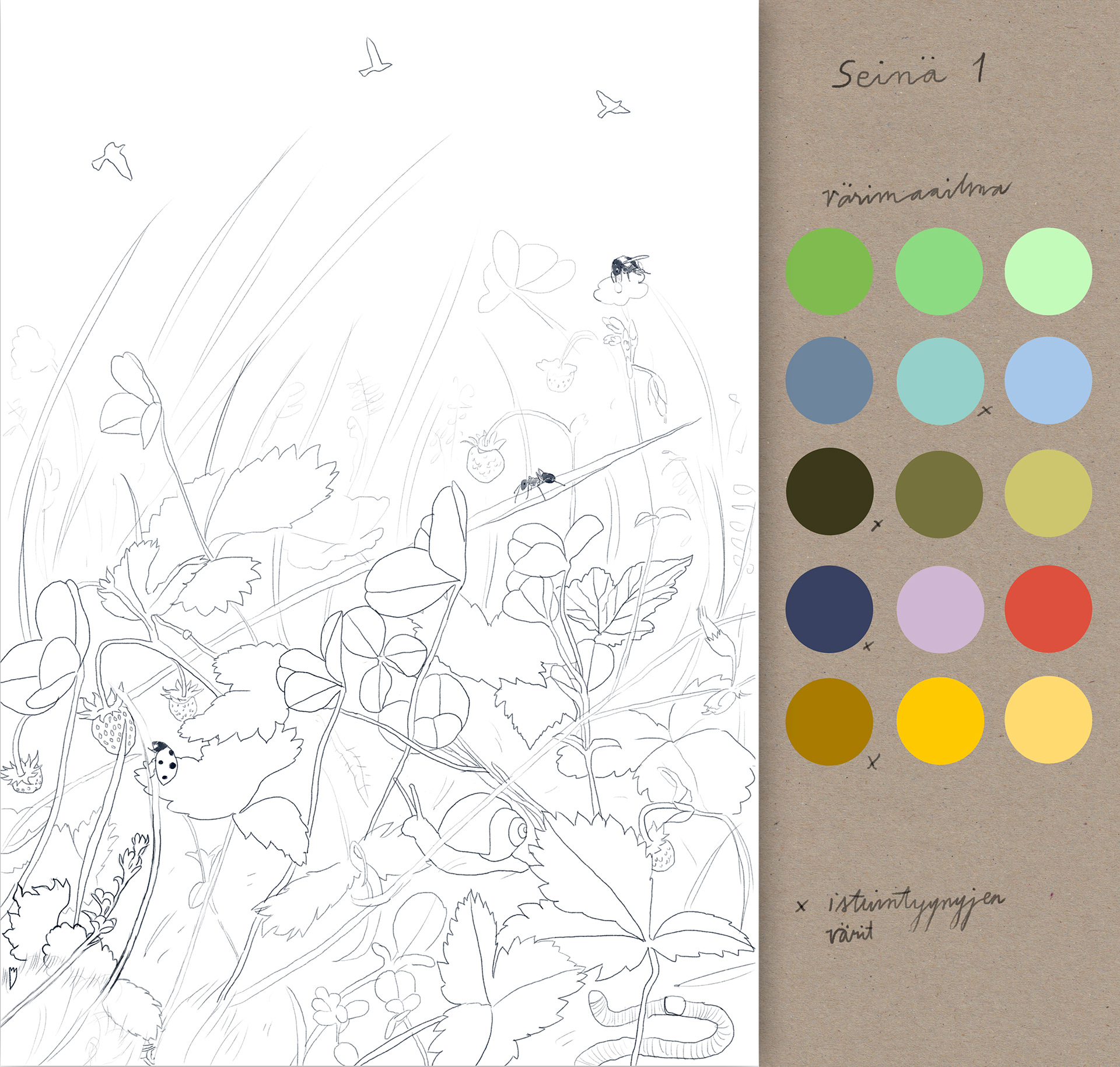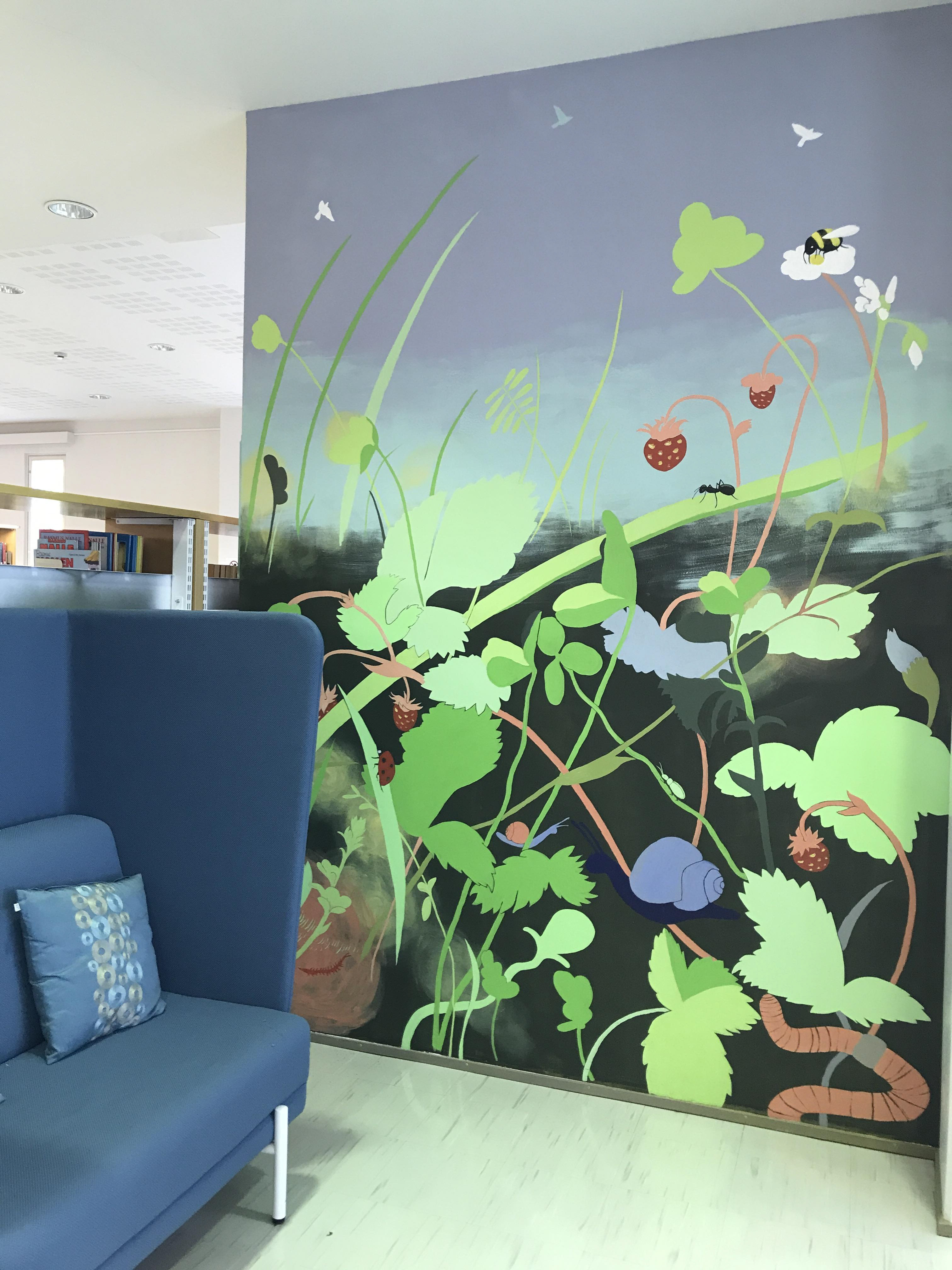Pääkirjaston lastenosastolle toteutin kaksiosaisen seinämaalauksen, jonka maailma jatkui vielä puusepältä tilatussa istuinrakenteessa. Aiheet maalaukseen valikoituivat ruohonjuuritasolta lähiluonnosta. Seinämaalauksen täytyi myös sointua tilassa aiemmin olleeseen suureen lasimaalaukseen.