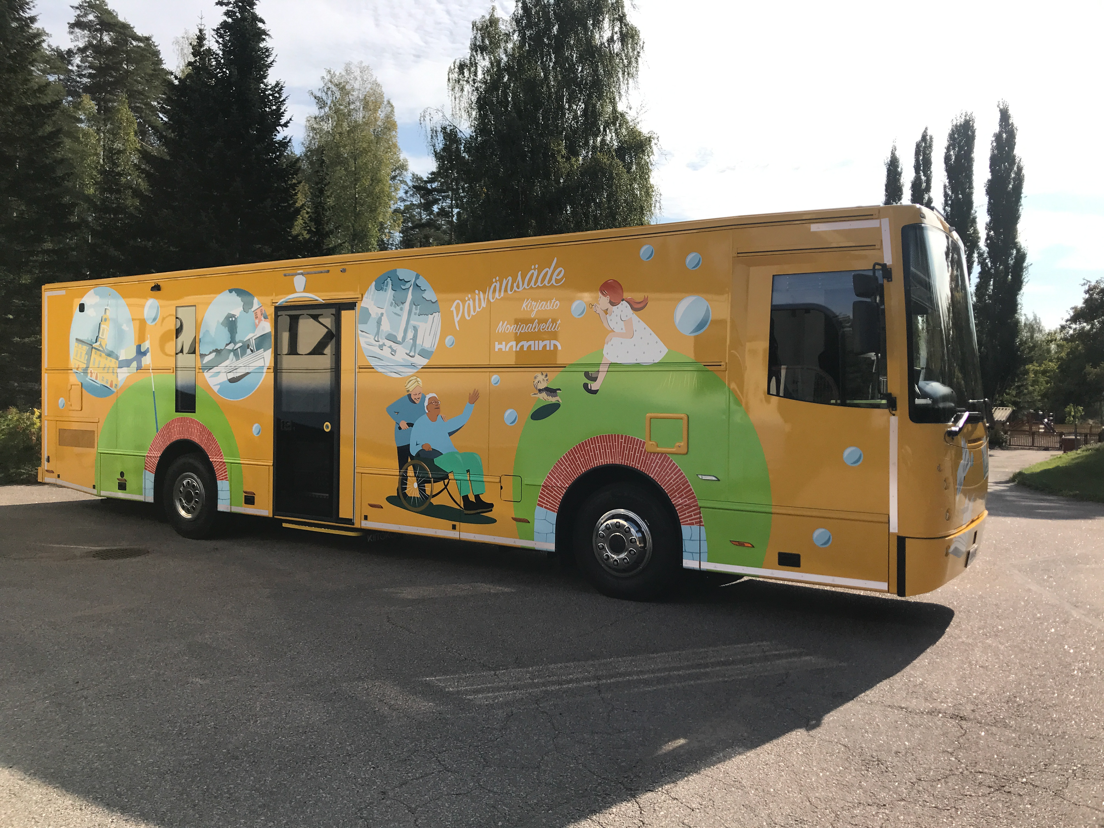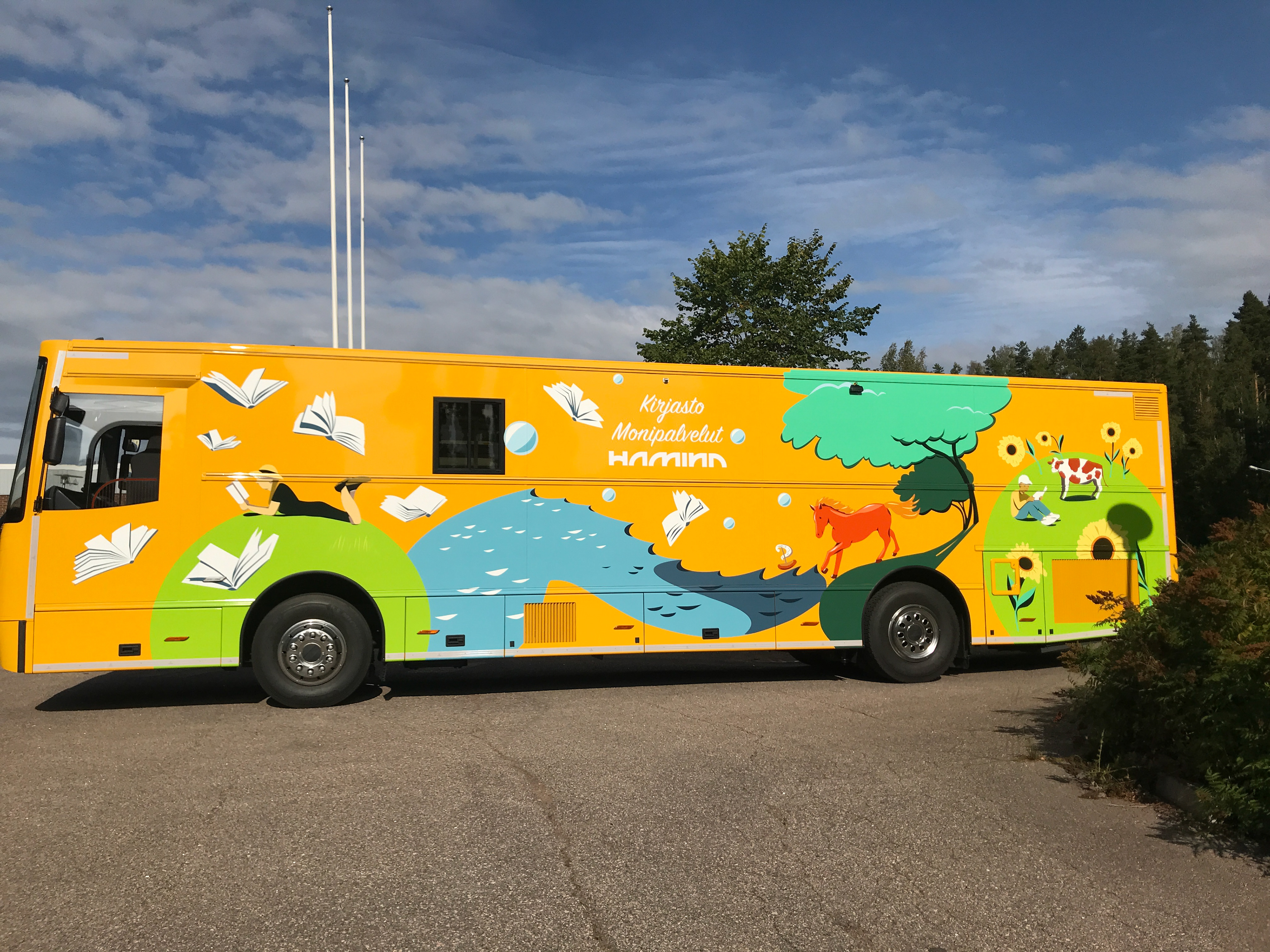 Sain suunnitella kuvituksen Haminan uudelle monipalveluautolle, joka otettiin käyttöön syksyllä 2021. Autoon toivottiin haminalaisia nähtävyyksiä, mutta myös kirjoja, satumaailmaa, merellisyyttä, eläimiä ja maaseutua. Kuvituksen suunnittelin vektoreina ja auton toteutti Kiitokori.